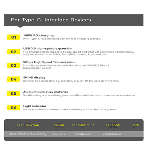 Model Number: Baseus Metal Series 8 in 1 Multifunctional Type-C HUB Docking Station